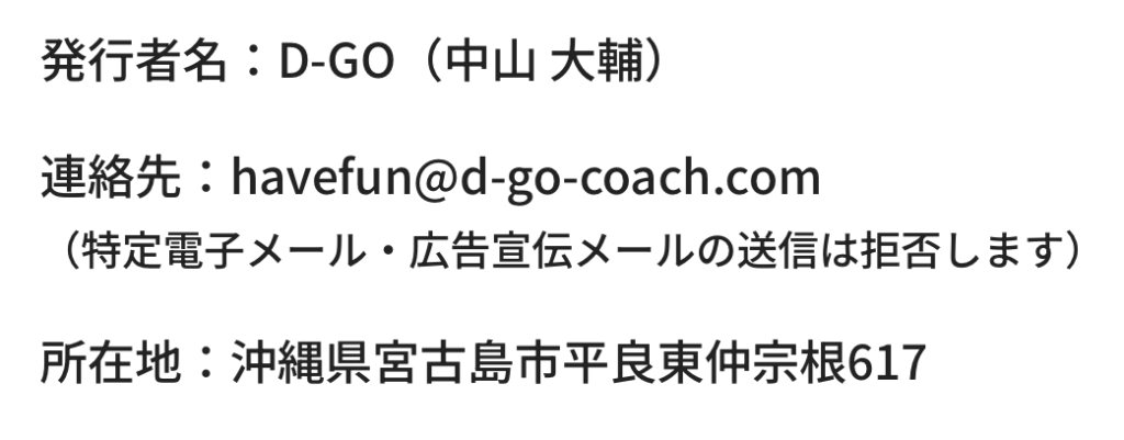 特定電子メール法に基づく表記 何かございましたらこちらのフォームからお問い合わせください。 お問い合わせ 発行者名:D-GO(中山 大輔) 連絡先:havefun@d-go-coach.com (特定電子メール・広告宣伝メールの送信は拒否します) 所在地:沖縄県宮古島市平良東仲宗根617